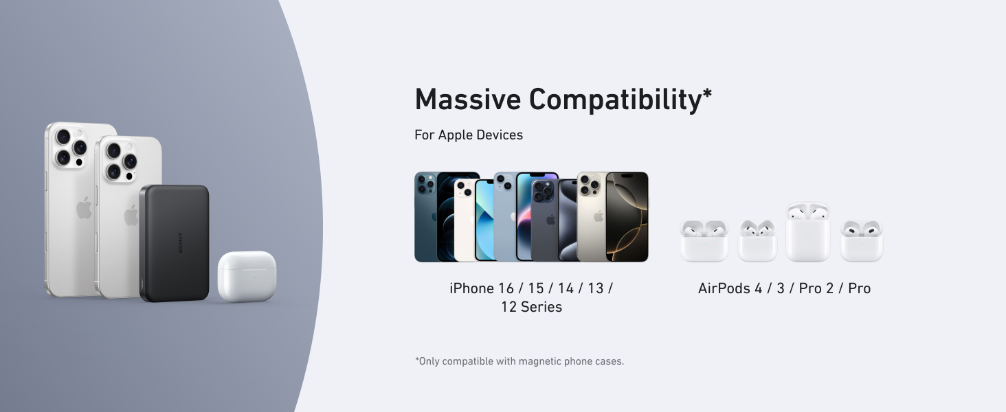 · Compatibility Note: This power bank is optimized for the iPhone 12/13/14/15 series with 15W magnetic fast charging capabilities. While it can charge Android devices such as Samsung and Google phones, they will not support the magnetic feature or achieve the 15W wireless charging speed, and will charge at a lower efficiency.